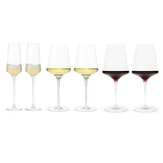Designed for sharing, the Six Glass Ensemble features two Champagne glasses, two Universal Wine glasses, and two Burgundy glasses. Ideal for family gatherings, dinners with friends, or festive celebrations.