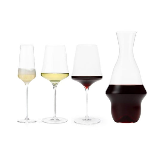 A complete tasting experience inspired by sommelier standards. This set includes one Decanter, one Burgundy glass, one Universal Wine glass, and one Champagne glass—perfectly covering red, white, and sparkling wines with elegance.
